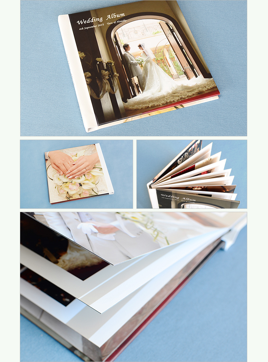 表紙 | 厚みのある紙素材、表・裏に写真入り、表に名前・日付入り |